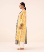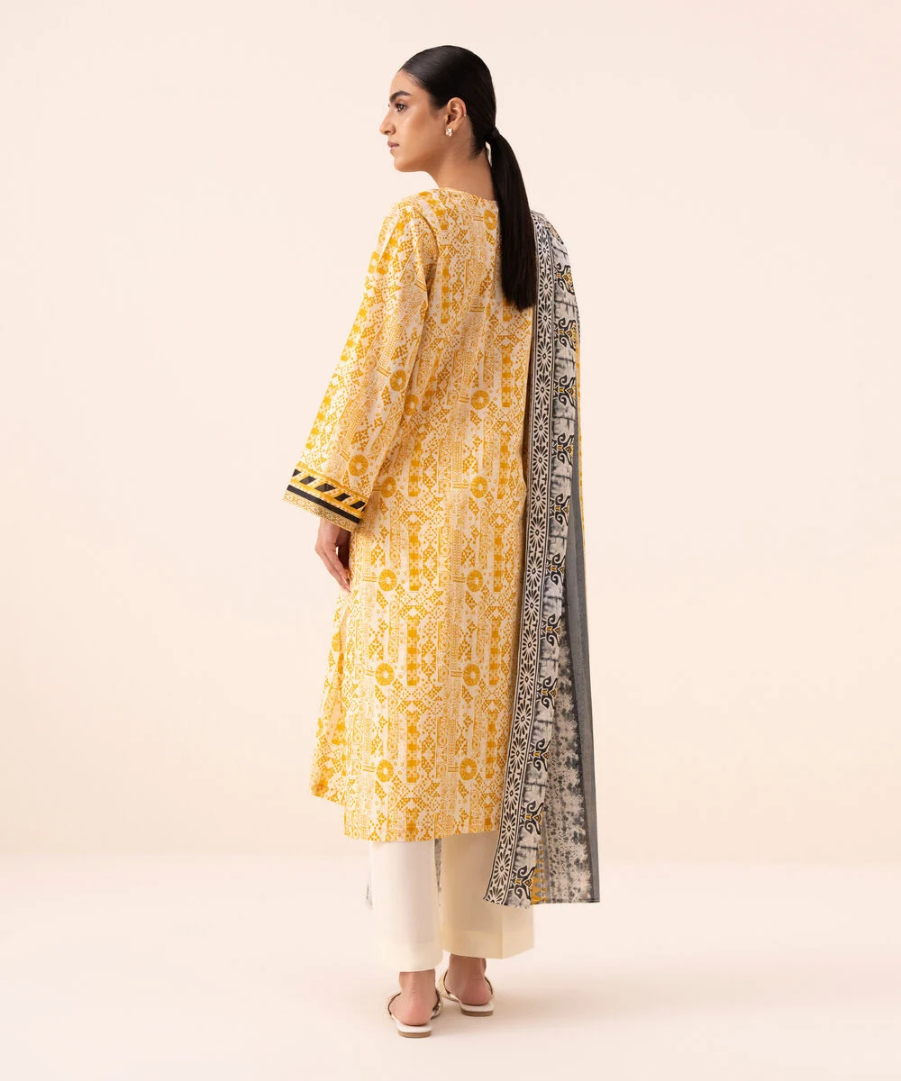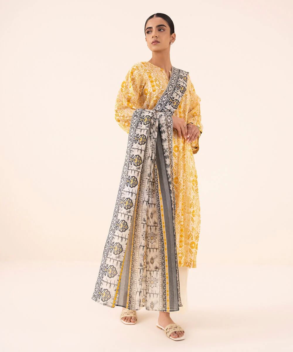 Elevate your style with our three-piece printed mustard ensemble featuring a cotton shirt and trousers paired with a black and white textured voile dupatta.