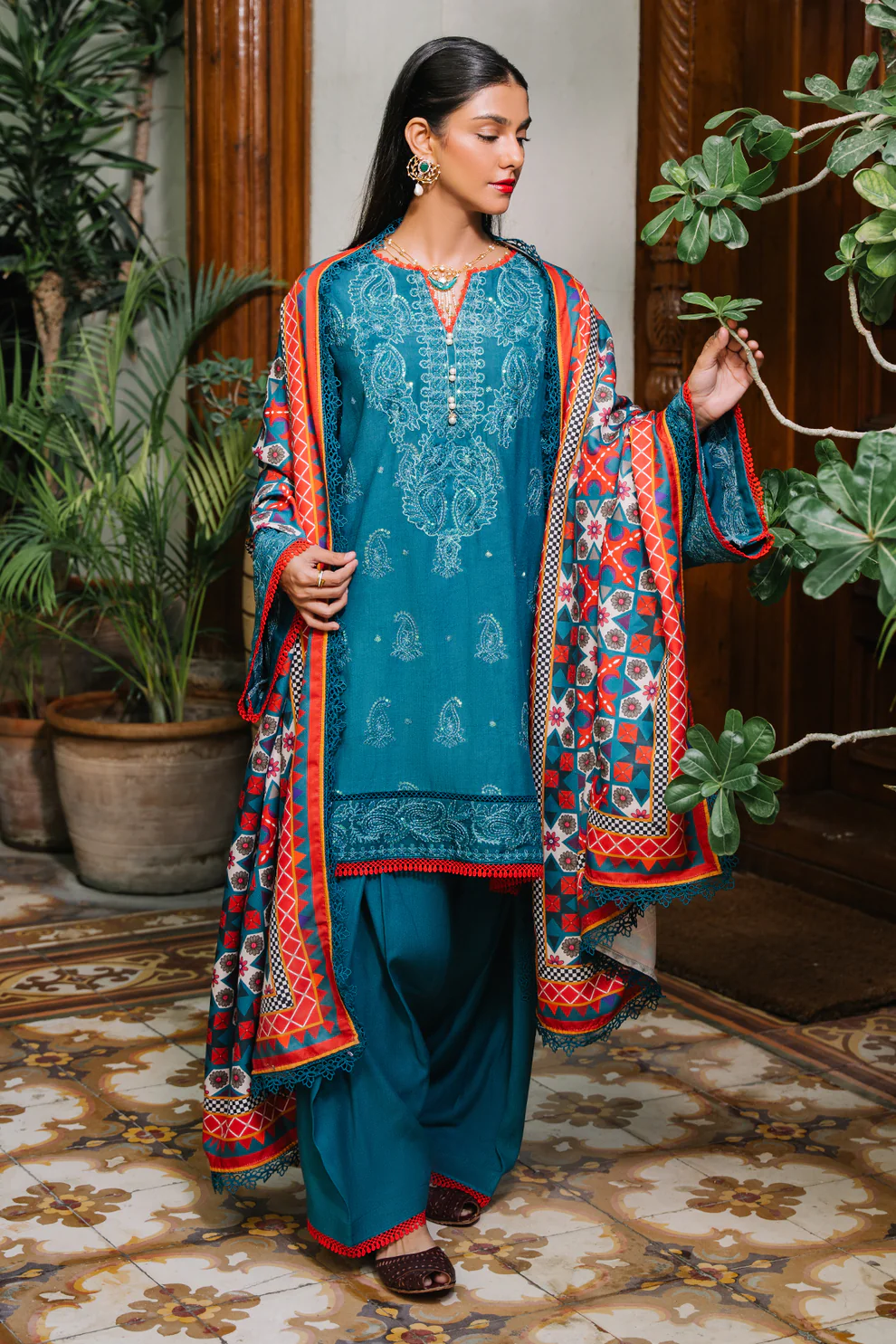 The set includes a printed khaddar shirt, a matching trouser, and a printed khaddar dupatta — giving you a complete winter-ready look with effortless styling.