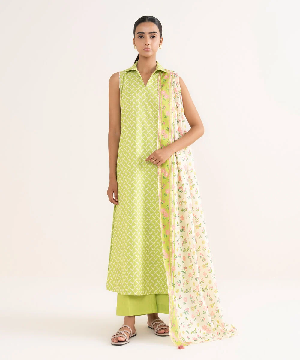 Make a statement with our three-piece printed lime green ensemble, featuring a cotton shirt and trousers paired with a fine voile dupatta.