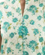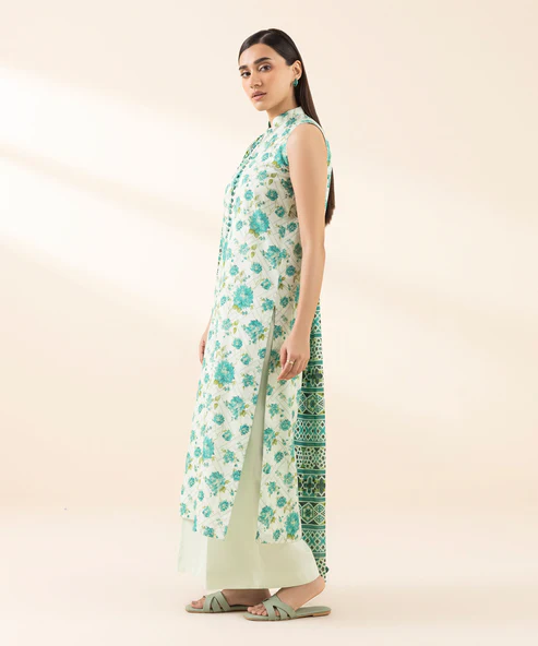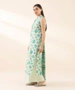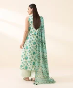 Make a statement with our three-piece printed pastel green and teal ensemble featuring a lawn shirt paired with a voile dupatta and cotton trousers.