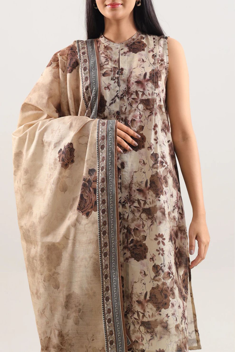 Saya Premium Printed Cotton Khaddar Shirt Trouser Dupatta | U04-25660-02B | Beige
