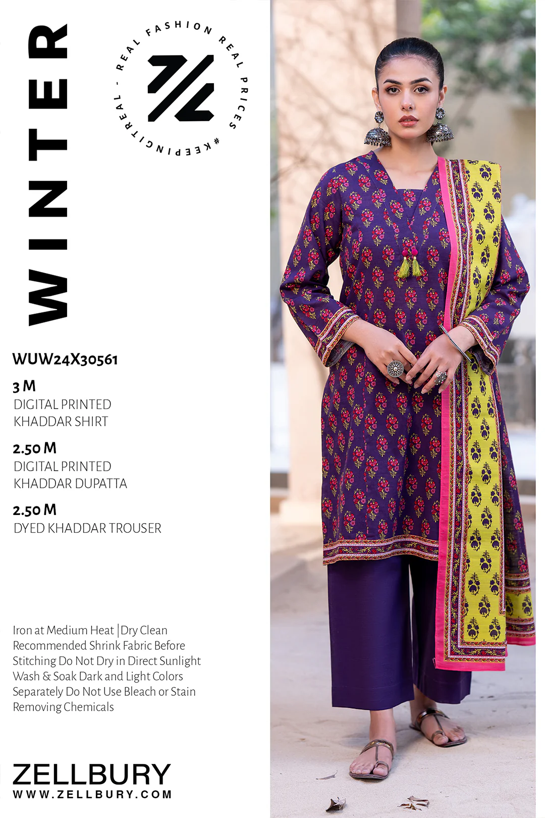 Zellbury Winter 3 Piece Printed Khaddar Suit for Women | WUW24X30446 | Nasima Fabrics
