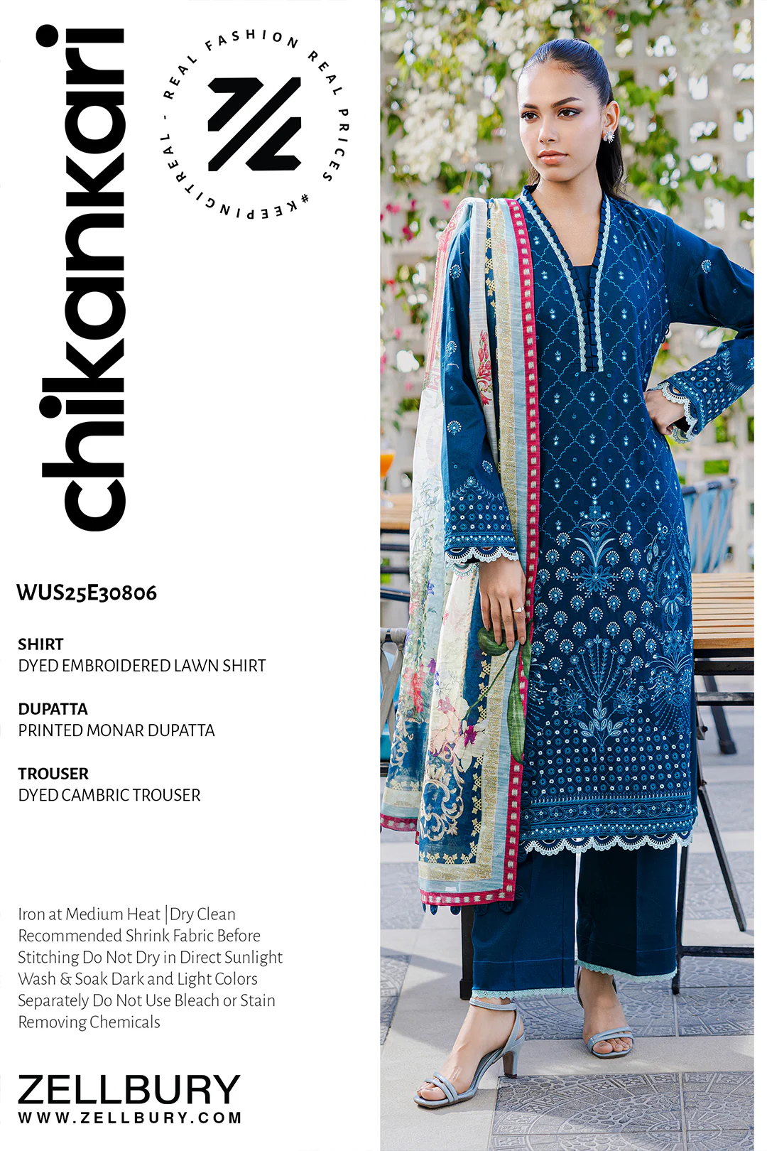 The Zellbury WUS25E30806 is a standout piece from the Zellbury Chikankari Spring/Summer Lawn Collection. This unstitched 3-piece ensemble features a deep Navy/Teal Blue palette combined with intricate Chikankari embroidery, offering a timeless look for festive occasions or sophisticated daily wear.